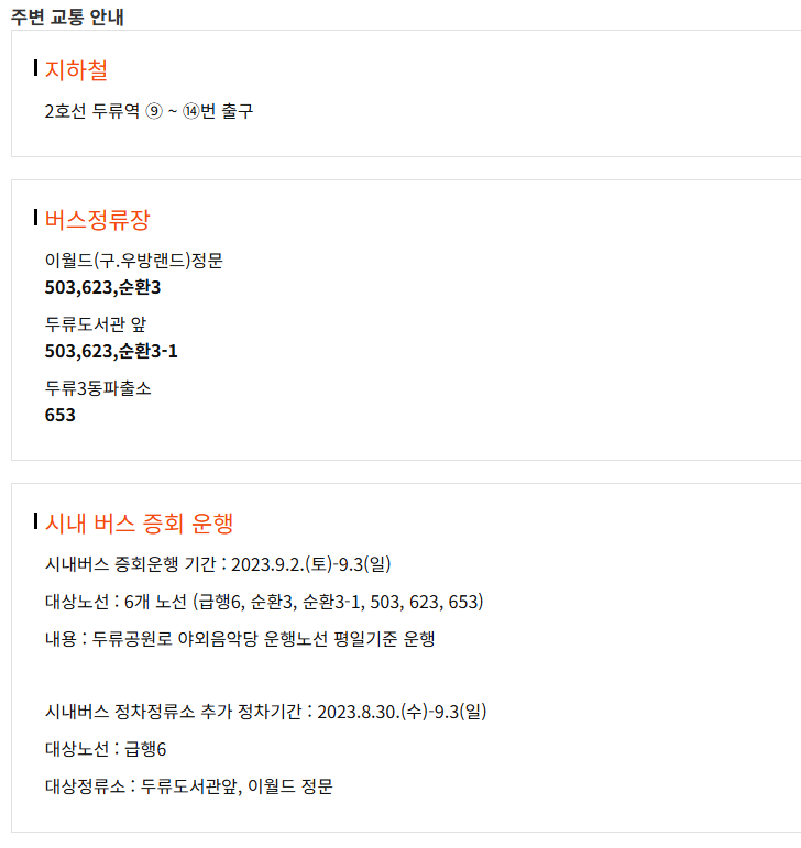 - 버스: 425, 503, 623, 650 등 두류공원 정류장 하차