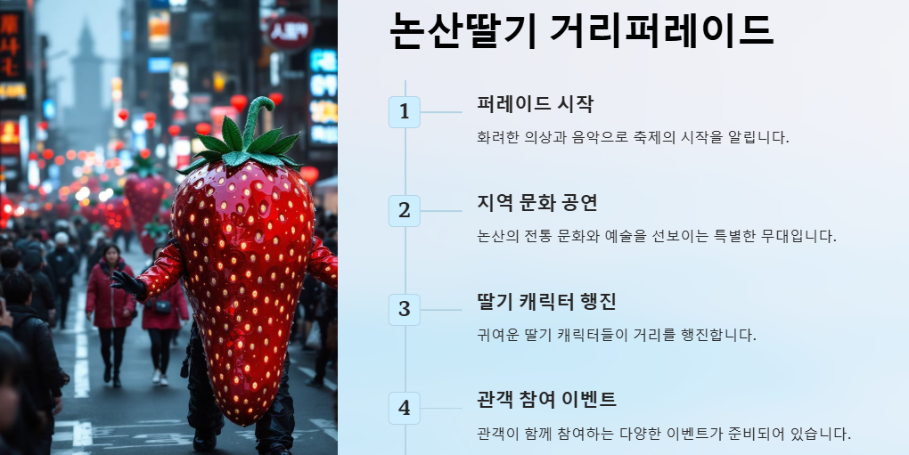 - 논산딸기 거리퍼레이드: 화려한 퍼레이드로 축제 분위기를 띄웁니다.